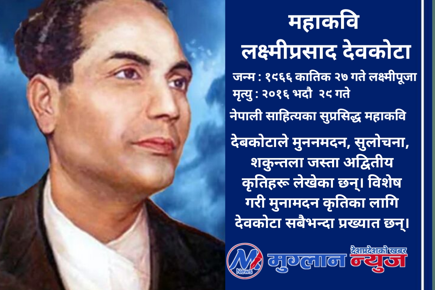 महाकवि देवकोटाको जन्म वि.सं. १९६६ मा कात्तिक कृष्ण औँसी अर्थात् लक्ष्मीपूजाका दिन काठमाडौँको डिल्लीबजारमा भएको थियो । १० वर्षको उमेरमा कविता लेख्न सुरु गर्नुभएका देवकोटाका थुप्रै महाकाव्य, खण्डकाव्य, निबन्ध, कथा, नाटक, उपन्यास, गीत, समालोचना र फुटकर कविता प्रकाशित छन् । उहाँले नेपाली साहित्यलाई सयभन्दा बढी कृति दिनुभयो । यी कृतिका माध्यमबाट देवकोटाले नेपाललाई अन्तर्राष्ट्रियस्तरमा समेत चिनाउनुभयो ।