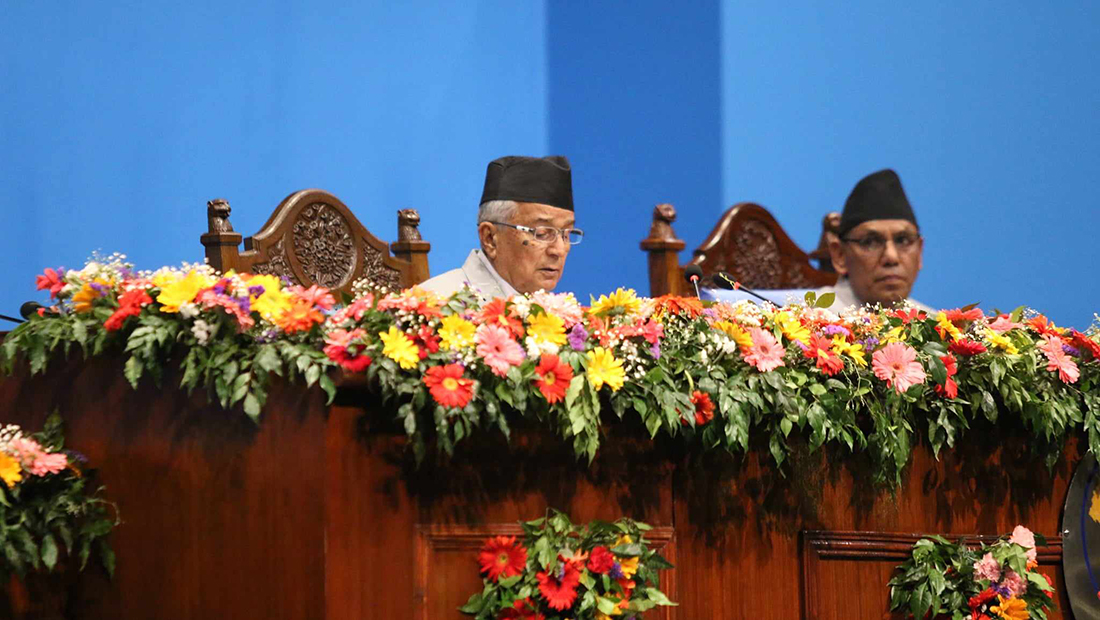 “वर्तमान सरकार देशमा समाजवाद उन्मुख आर्थिक, सामाजिक रुपान्तरणका लागि राजनीतिक स्थायित्व, सुशासन, विकास र सामाजिक न्यायसहित समृद्ध नेपालः सुखी नेपालीको राष्ट्रिय दायित्व पूरा गर्न प्रतिबद्ध छ । नेपाली जनताको सुख, समुन्नतिका लागि संंघीय लोकतान्त्रिक गणतन्त्रलाई सुदृढ गर्दै जनतामा राज्यप्रति आशा र भरोसा जगाउने गरी सरकारले आफ्नो नीति तथा कार्यक्रम कार्यान्वयन गर्दै आएको छ । सविधान कार्यान्वयन, संघीयताको सबलीकरण, अर्थतन्त्रको सुधार र पुनःउत्थान, उत्पादन र उत्पादकत्व वृद्धि, रोजगारी सृजना, सुशासन प्रवर्द्धन, सार्वजनिक सेवामा सुधार र सरलीकरण, नागरिकमैत्री शासन प्रणालीको स्थापना तथा भ्रष्टाचार नियन्त्रण सरकारको मुख्य प्राथमिकता रहेका छन्,” राष्ट्रपति पौडेलले भने ।