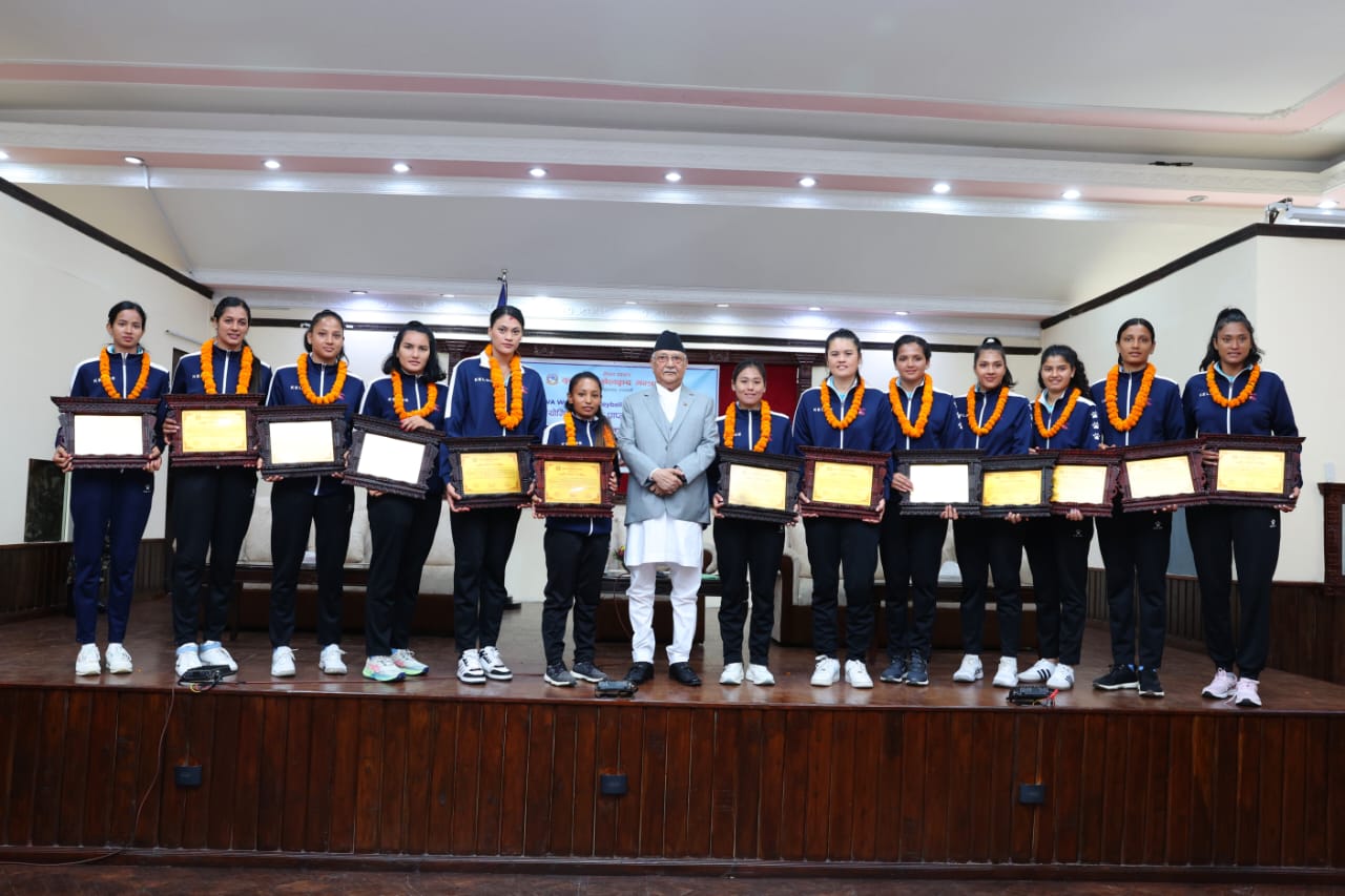 प्रधानमन्त्रीबाट महिला भलिबल खेलाडीलाई पुरस्कार वितरण