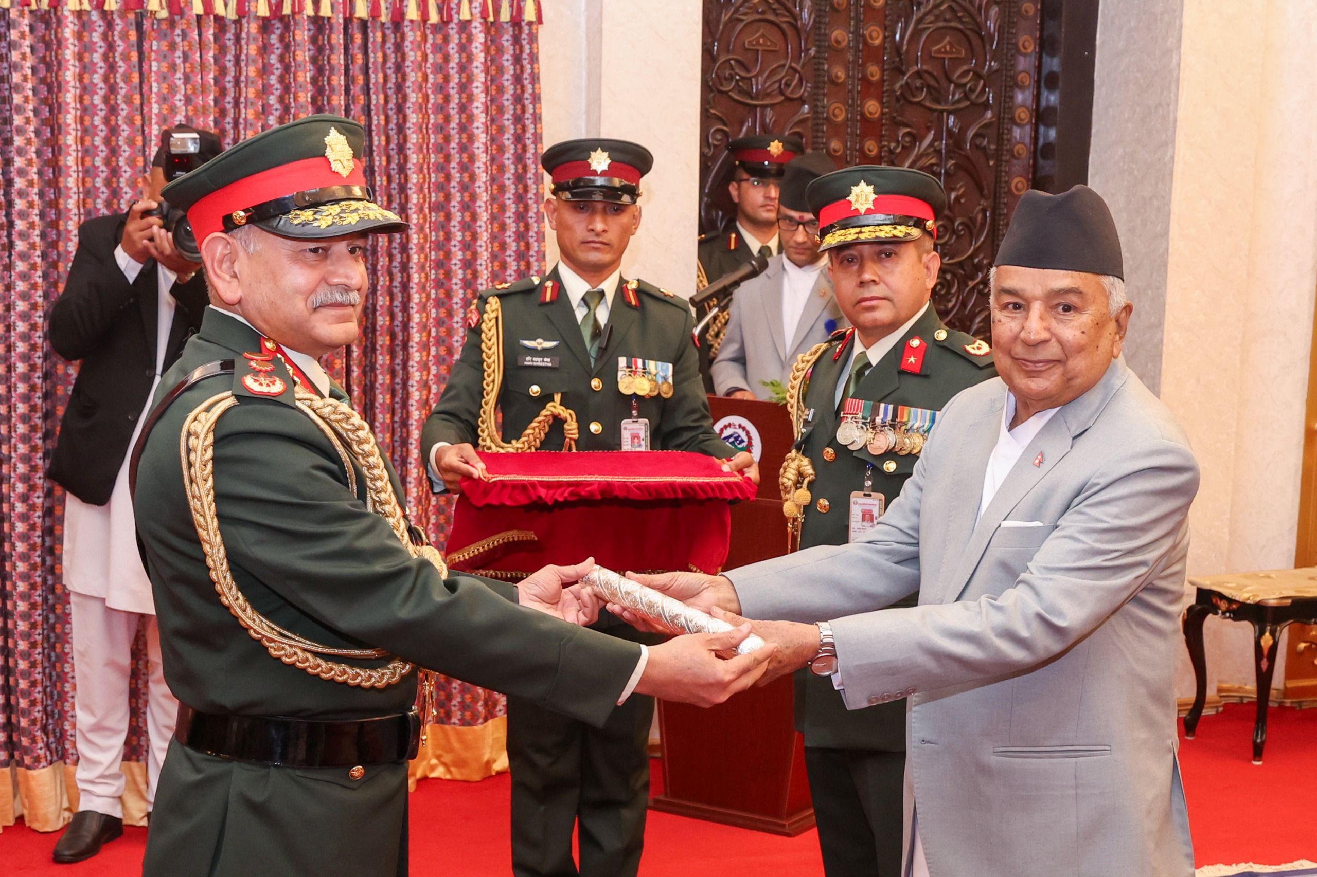 काठमाडौं/६ मंसिर, राष्ट्रपति रामचन्द्र पौडेलले भारतीय स्थल सेनाध्यक्ष उपेन्द्र द्विवेदीलाई आज मानार्थ महारथीको दर्ज्यानी चिन्ह तथा खड्ग प्रदान गर्नुभएको छ ।