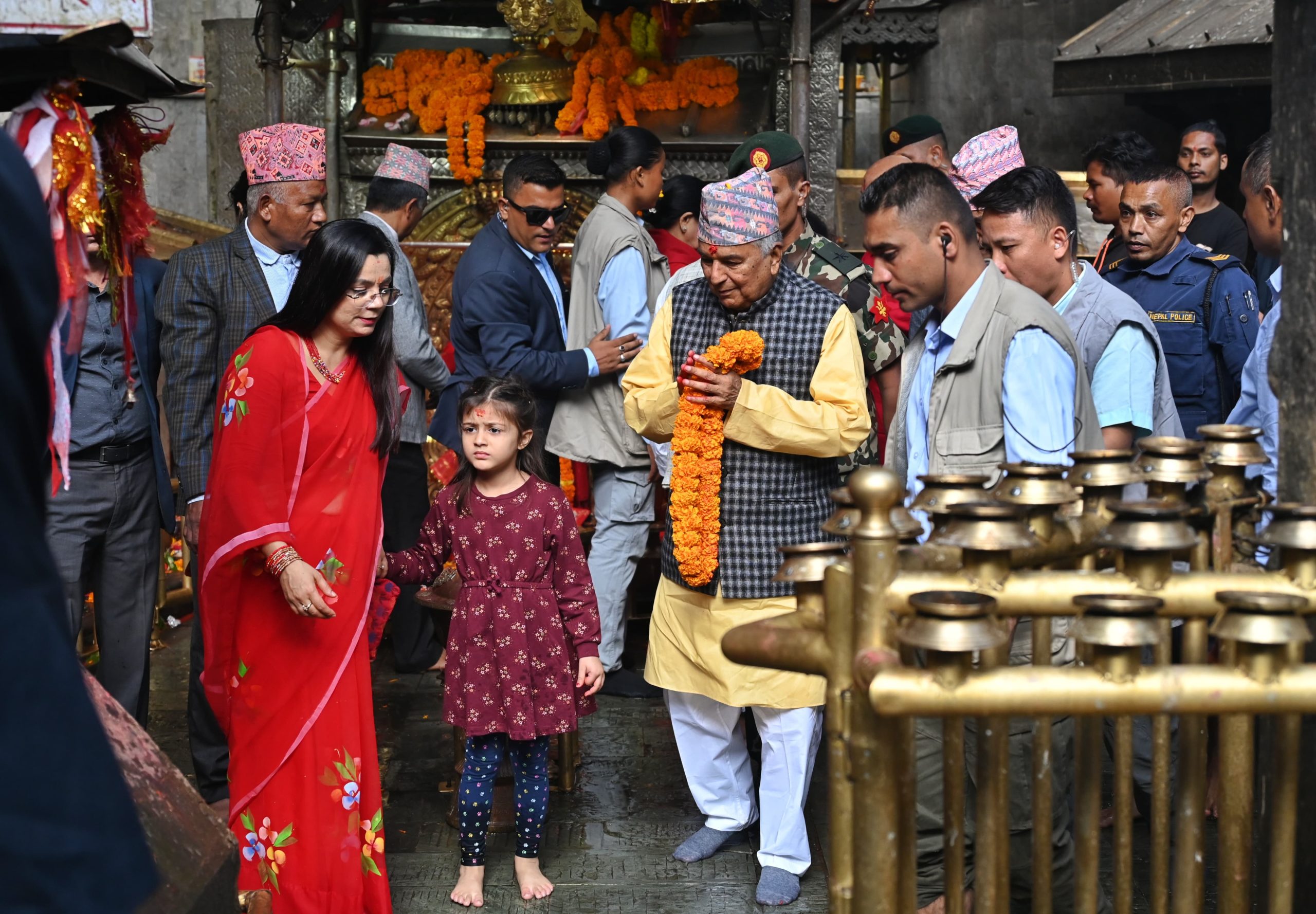 काठमाडौ/ २१ असाेज, राष्ट्रपति रामचन्द्र पाैडेल प्रथम महिला सबिता पाैडेलसहित बडादशैंकाे अवसरमा साेमबार बिहान दक्षिणकाली मन्दिर जानुभई दक्षिणकाली माताकाे पूजा अर्चना गर्नुका साथै पूजारीबाट टीका प्रसाद ग्रहण गर्नुभयो ।